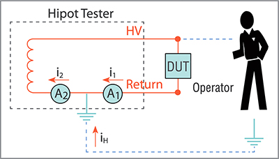 Hipot and Dielectric Withstand test equipment can present an electrical shock hazard to the test operator. Test equipment manufacturers have included a GROUND FAULT INTERRUPT (GFI) circuit to help prevent the operator from being electrically shocked. A ground fault exists whenever currents i1 and i2 are not equal, as shown in the figure below.